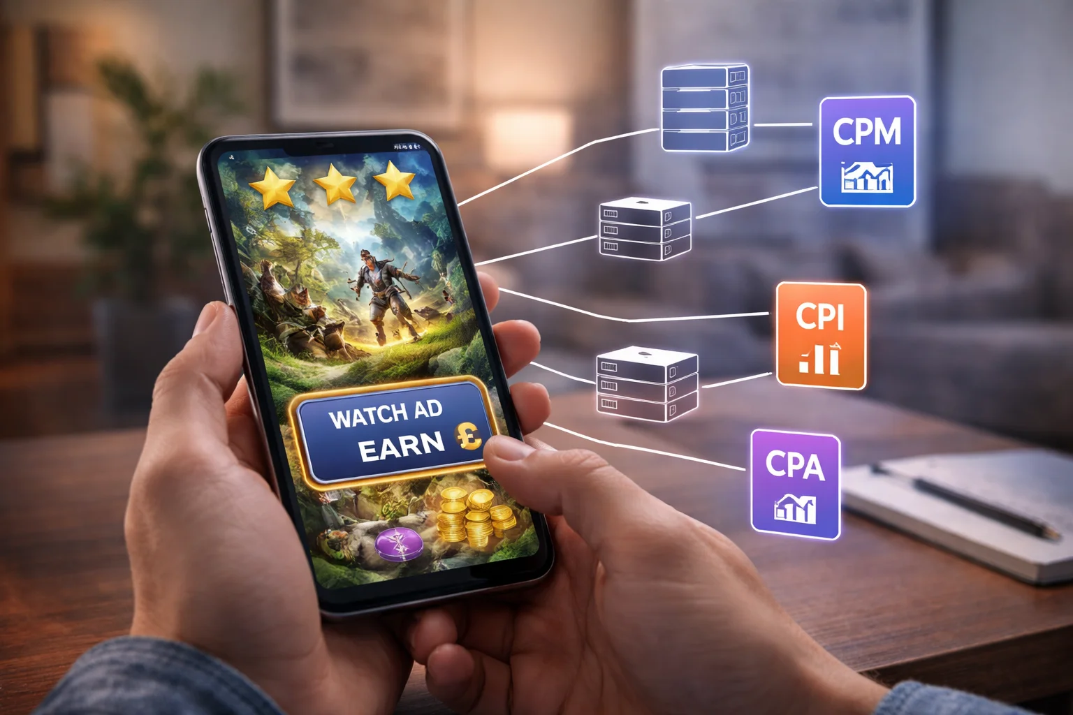 When a player reaches a point in the game where an ad can appear, such as finishing a level or opening a reward chest, the game sends an ad request to the network. The network then evaluates which advertisers are a good fit for that particular player and moment. Once a match is found, the ad is delivered to the player. Revenue is generated depending on the network’s pricing model, whether it is CPM (cost per thousand impressions), CPI (cost per install), or CPA (cost per action).